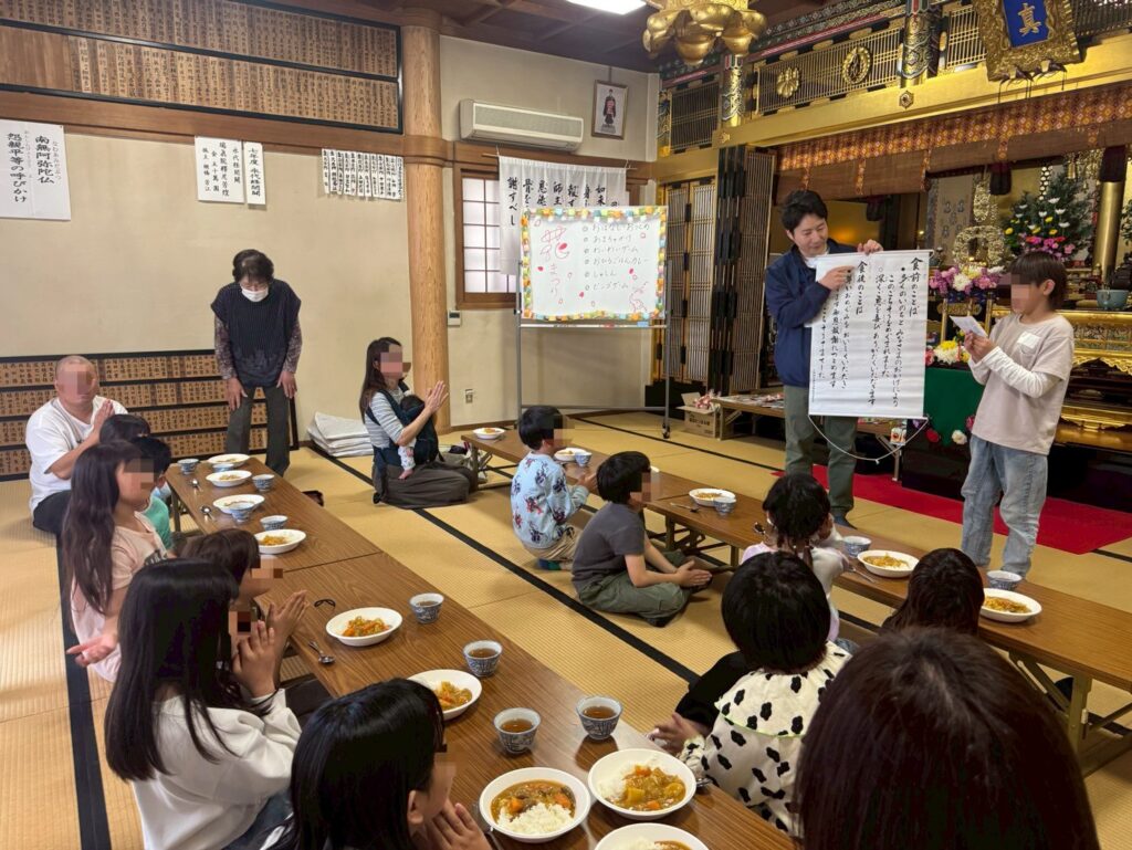 お楽しみの昼食は、花びら型の人参が入った、特製「花まつりカレー」です。「あ、お花が入ってる!」と子どもたちも大喜び。最後はビンゴゲームも行い、最初から最後まで笑顔の絶えない、充実した一日となりました。